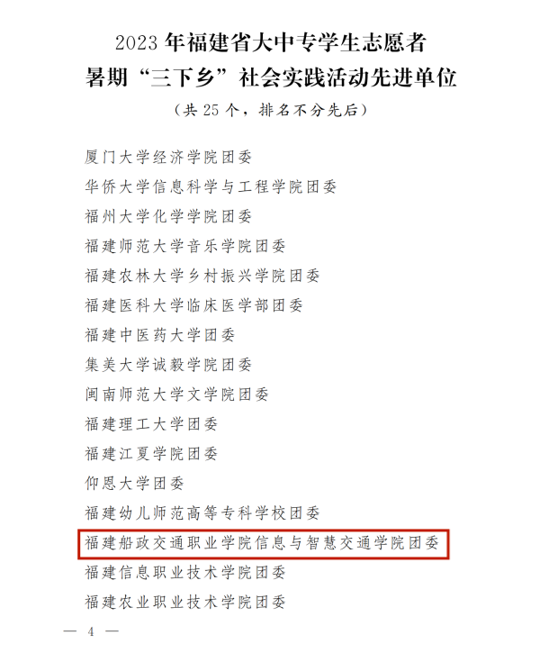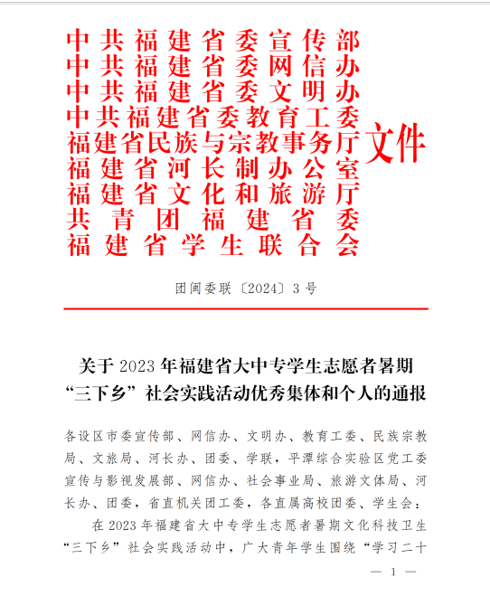 近日,在2023年福建省大中專學(xué)生志愿者暑期文化科技衛(wèi)生“三下鄉(xiāng)”社會實踐活動總結(jié)表彰中,我院榮獲2023年福建省大中專學(xué)生志愿者暑期“三下鄉(xiāng)”社會實踐活動先進單位。