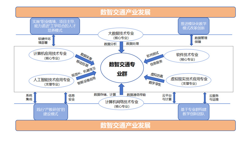 圍繞“數(shù)據(jù)”元素,從數(shù)據(jù)采集→數(shù)據(jù)安全傳輸存儲→數(shù)據(jù)分析與處理→數(shù)據(jù)結(jié)果呈現(xiàn)→測試、 實(shí)施環(huán)節(jié), 構(gòu)建信息產(chǎn)業(yè)與智慧交通產(chǎn)業(yè)的人才培養(yǎng)鏈。