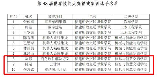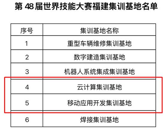 近日,福建省人力資源和社會(huì)保障廳正式公布第48屆世界技能大賽福建省集訓(xùn)基地名單,我院云計(jì)算、移動(dòng)應(yīng)用開(kāi)發(fā)兩大項(xiàng)目基地成功入選。同時(shí),我院三名優(yōu)秀選手憑借過(guò)硬技能實(shí)力,成功入圍本屆福建省集訓(xùn)隊(duì)。