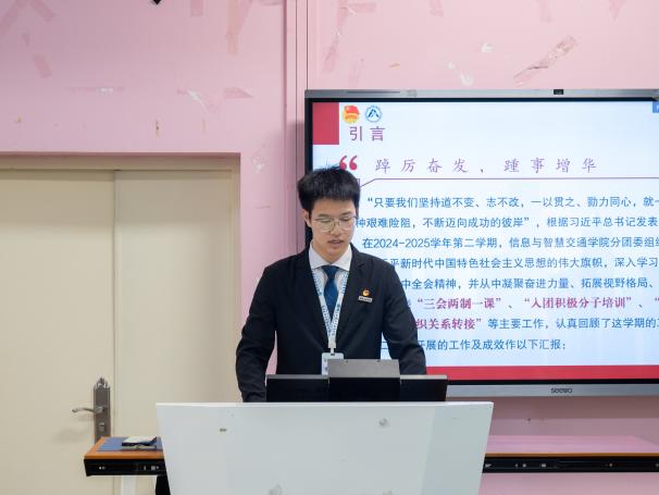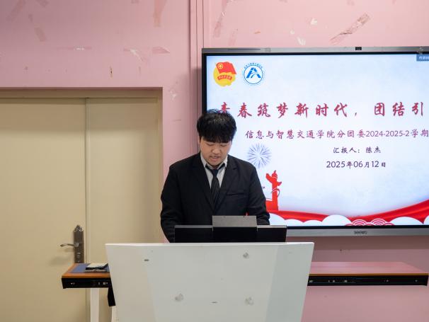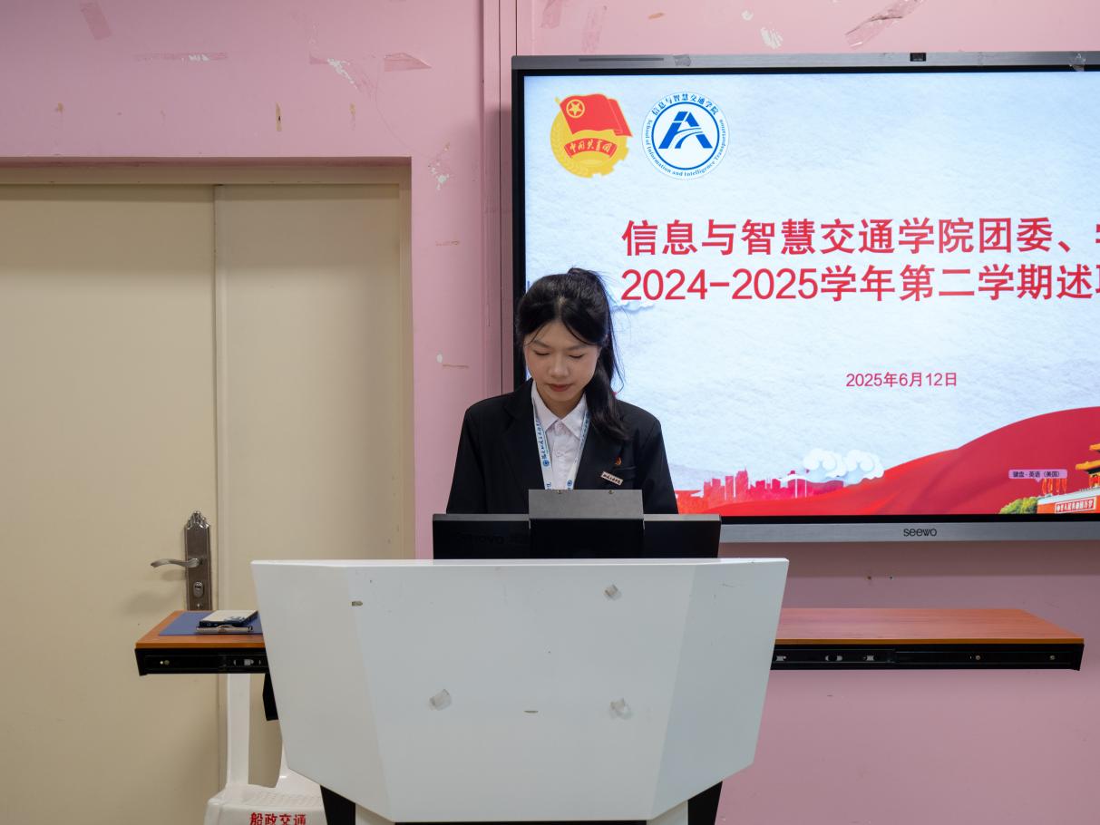 為總結(jié)2024-2025學(xué)年第二學(xué)期工作成效,凝聚團(tuán)學(xué)組織發(fā)展動(dòng)能,推動(dòng)學(xué)生工作在新時(shí)代教育實(shí)踐中提質(zhì)增效,2025年6月12日,信息與智慧交通學(xué)院2024-2025-2學(xué)期兩委干部述職大會(huì)在福道園自強(qiáng)樓2-3教室舉行。學(xué)院分團(tuán)委副書記沈晨晞、學(xué)院團(tuán)組織學(xué)生干部、學(xué)院學(xué)生會(huì)工作人員及學(xué)生代表參加會(huì)議。會(huì)議由學(xué)院分團(tuán)委兼職副書記(學(xué)生)朱翠琪主持。