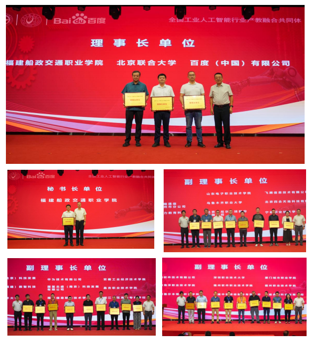 大會現(xiàn)場舉行了理事長單位、副理事長單位、常務(wù)理事單位及理事單位授牌儀式,百度(中國)有限公司、北京聯(lián)合大學(xué)、福建船政交通職業(yè)學(xué)院榮膺理事長單位,福建船政交通職業(yè)學(xué)院當(dāng)選秘書長單位,并順利通過了《全國工業(yè)人工智能行業(yè)產(chǎn)教融合共同體章程》。