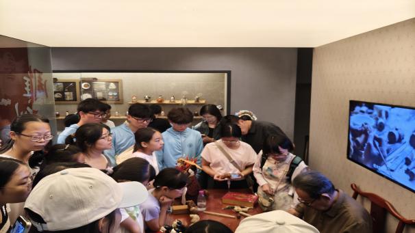 成員們圍攏在木偶工作臺旁,老匠人的刻刀起落間,木屑紛飛,他們從中感知木偶頭“三分面七分神”的奧秘。展柜里,閩南民居模型的榫卯結構吸引著傳承團成員,他們反復端詳。聆聽非遺故事,觸摸技藝溫度,傳承團心中滿是對閩藝的震撼與傳承熱忱。