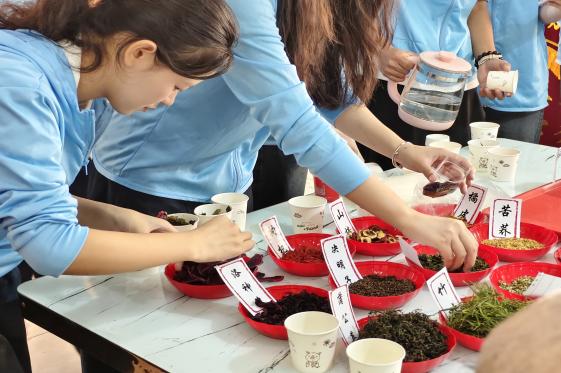 社區(qū)活動室內(nèi),陣陣花草香悄然彌漫。實踐團成員們提前備好枸杞、洛神花、玫瑰、決明子等應(yīng)季花草食材,細心清洗、分類分裝。當(dāng)老人們陸續(xù)入座,年輕的身影在茶桌間穿梭忙碌:溫水潤杯、投茶注水,動作雖略顯生澀,卻透著十足的認(rèn)真。