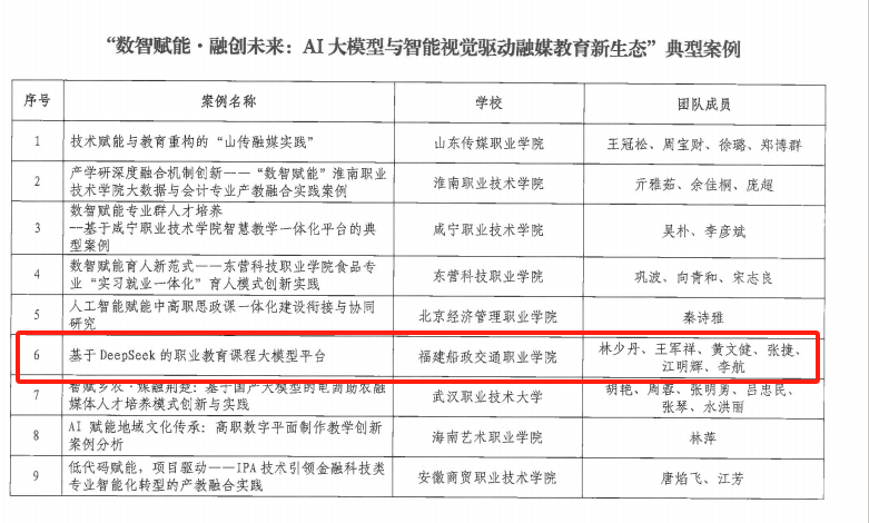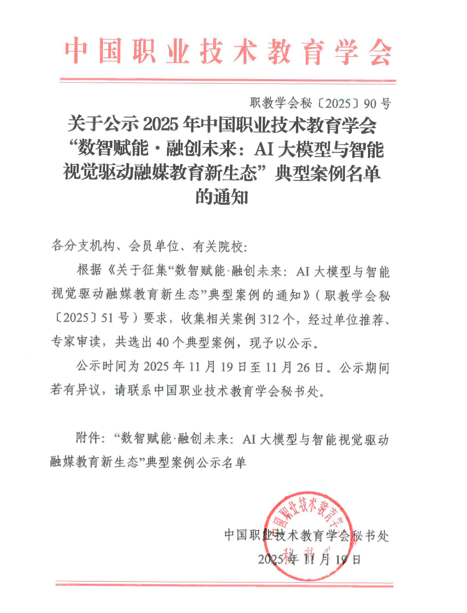 近日,我院申報的“基于DeepSeek的職業(yè)教育課程大模型平臺”案例,經中國職業(yè)技術教育學會組織評審,入選“2025年數(shù)智賦能·融創(chuàng)未來:AI大模型與智能視覺驅動融媒教育新生態(tài)”典型案例。