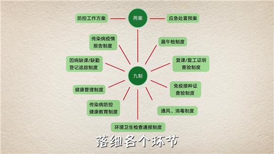 學校要完善組織領導,落實分工責任,加強校園管理,強化健康管理,校內(nèi)建立四級工作網(wǎng)絡,校外建立聯(lián)防聯(lián)控機制,加強培訓演練,組織應急處置。實行全體師生員工健康“日報告”“零報告”制度。建立“兩案九制”,落細各個環(huán)節(jié)。