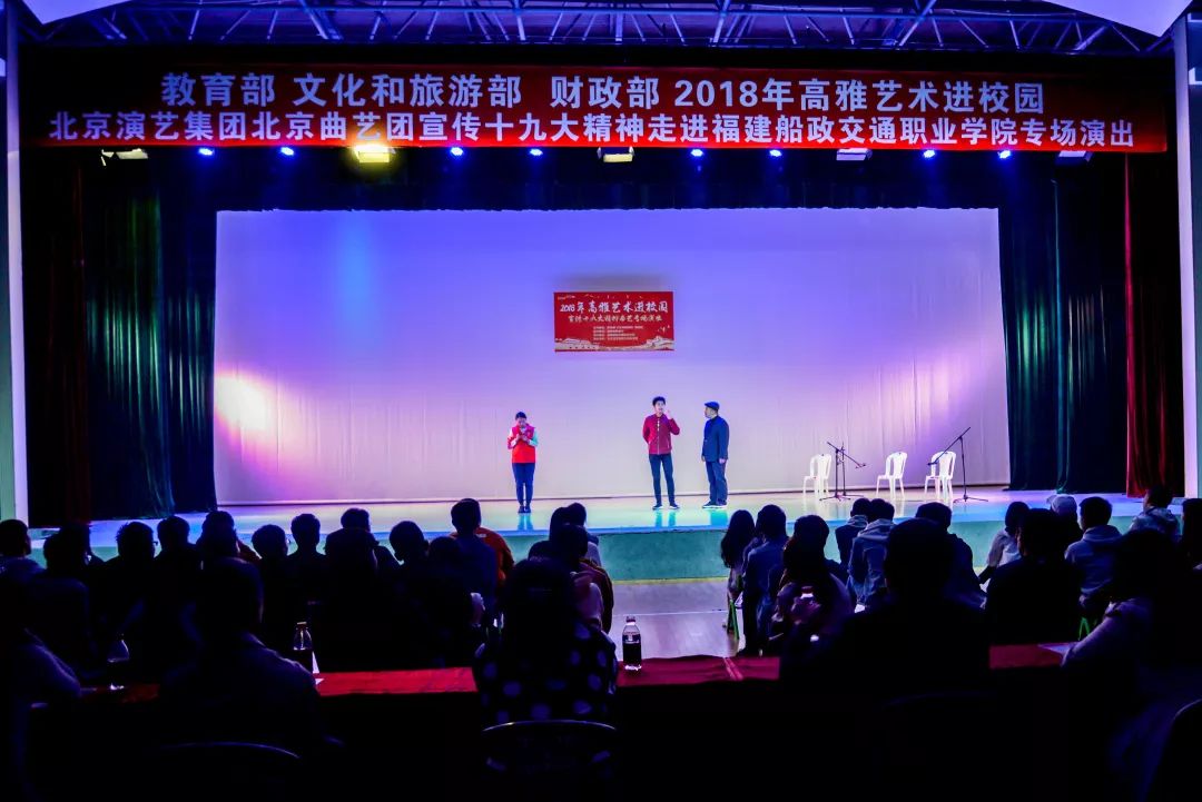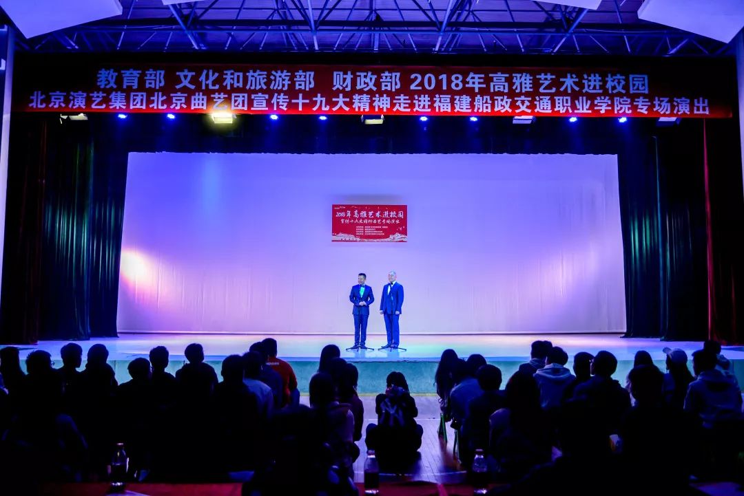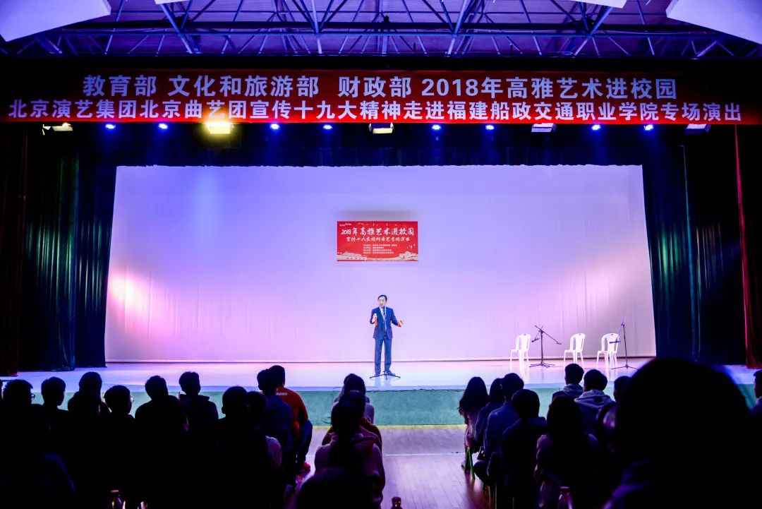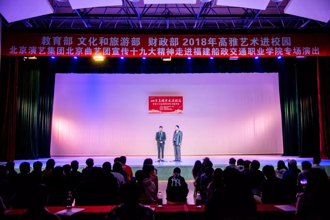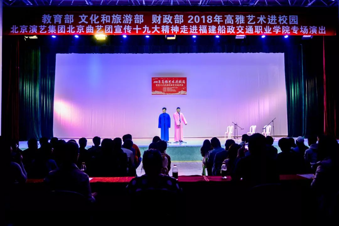 為深入學習貫徹黨的十九大精神,積極主動投身習近平新時代中國特色社會主義思想“大學習”熱潮中,11月22日,由教育部、文化旅游部和財政部三部委聯合舉辦,福建船政交通職業(yè)學院承辦的“高雅藝術進校園——北京演藝集團北京曲藝園走進船政校園專場”在我校文體活動中心舉行。