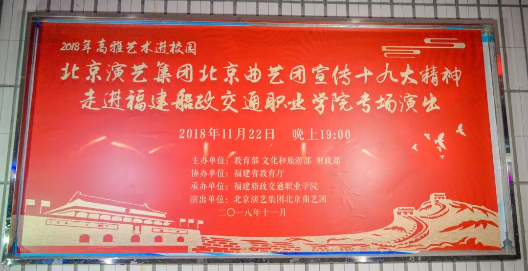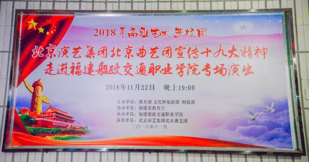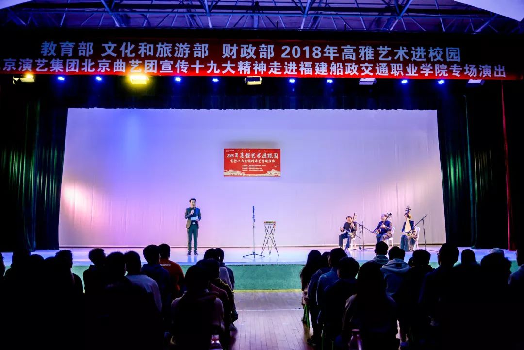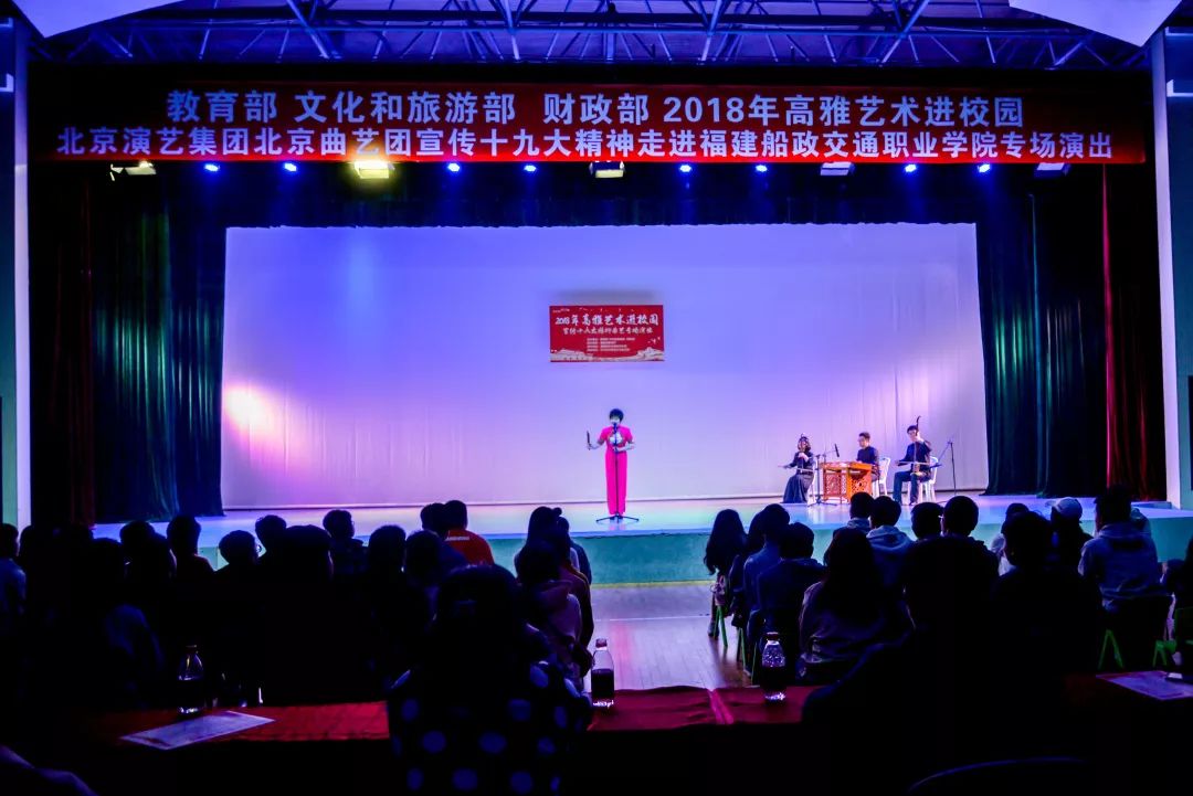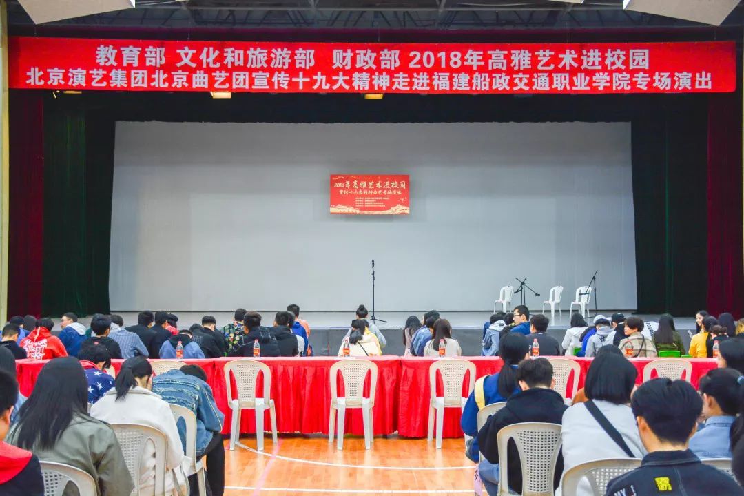 為深入學習貫徹黨的十九大精神,積極主動投身習近平新時代中國特色社會主義思想“大學習”熱潮中,11月22日,由教育部、文化旅游部和財政部三部委聯合舉辦,福建船政交通職業(yè)學院承辦的“高雅藝術進校園——北京演藝集團北京曲藝園走進船政校園專場”在我校文體活動中心舉行。