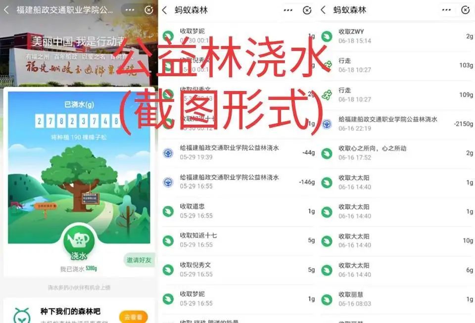 登錄三全育人平臺搜索“船政公益林澆水7/8/9月活動”活動,點(diǎn)擊“立即報名”,選擇報名信息“個人”后,上傳在7/8/9月為每個月學(xué)校公益林澆水量不少于5000g的截圖即可獲得三全育人“校園活動”模塊1積分哦,10000g可獲得2積分以此類推,每人兌換上限為10積分。大家在標(biāo)題需要備注:學(xué)院班級姓名學(xué)號,截圖需要截到日期噢~
