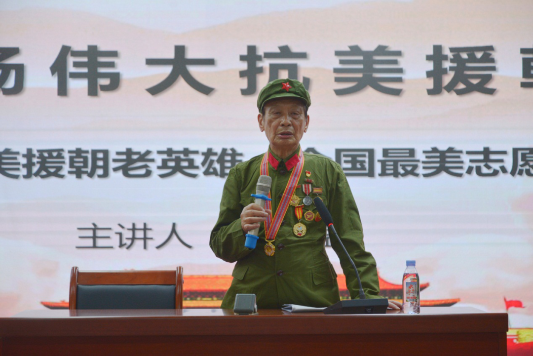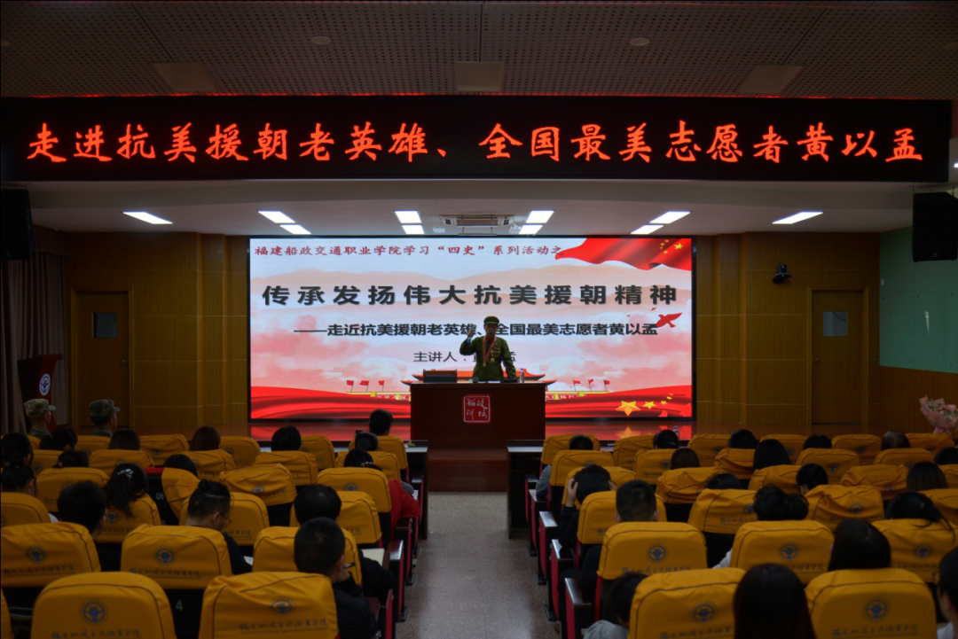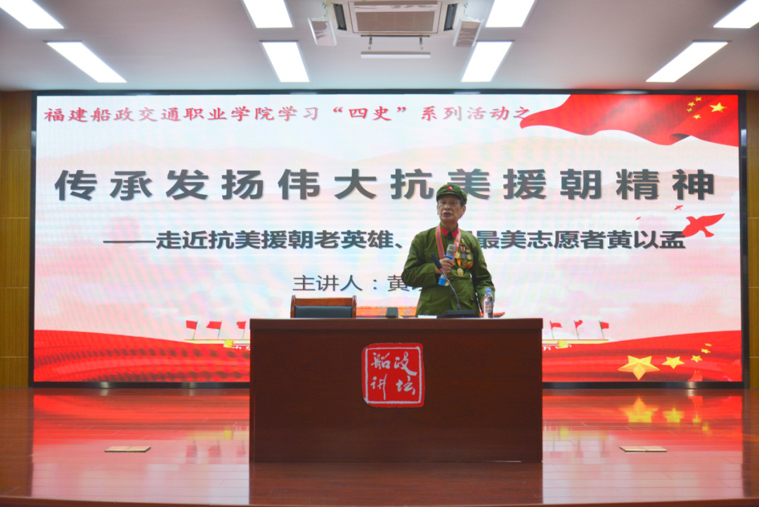 歷史是最好的“教科書”“營(yíng)養(yǎng)劑”和“清醒劑”。“四史”學(xué)習(xí)教育是引領(lǐng)青年學(xué)生堅(jiān)定理想信念、矢志拼搏奮斗、砥礪奮進(jìn)社會(huì)主義現(xiàn)代化國(guó)家建設(shè)新征程的信仰之源和力量之泉。值此抗美援朝戰(zhàn)爭(zhēng)勝利70周年之際,11月3日下午,我校邀請(qǐng)抗美援朝老英雄、全國(guó)最美志愿者、89歲高齡的黃以孟老先生蒞臨學(xué)校開展《傳承發(fā)揚(yáng)偉大抗美援朝精神》專題報(bào)告會(huì)。
