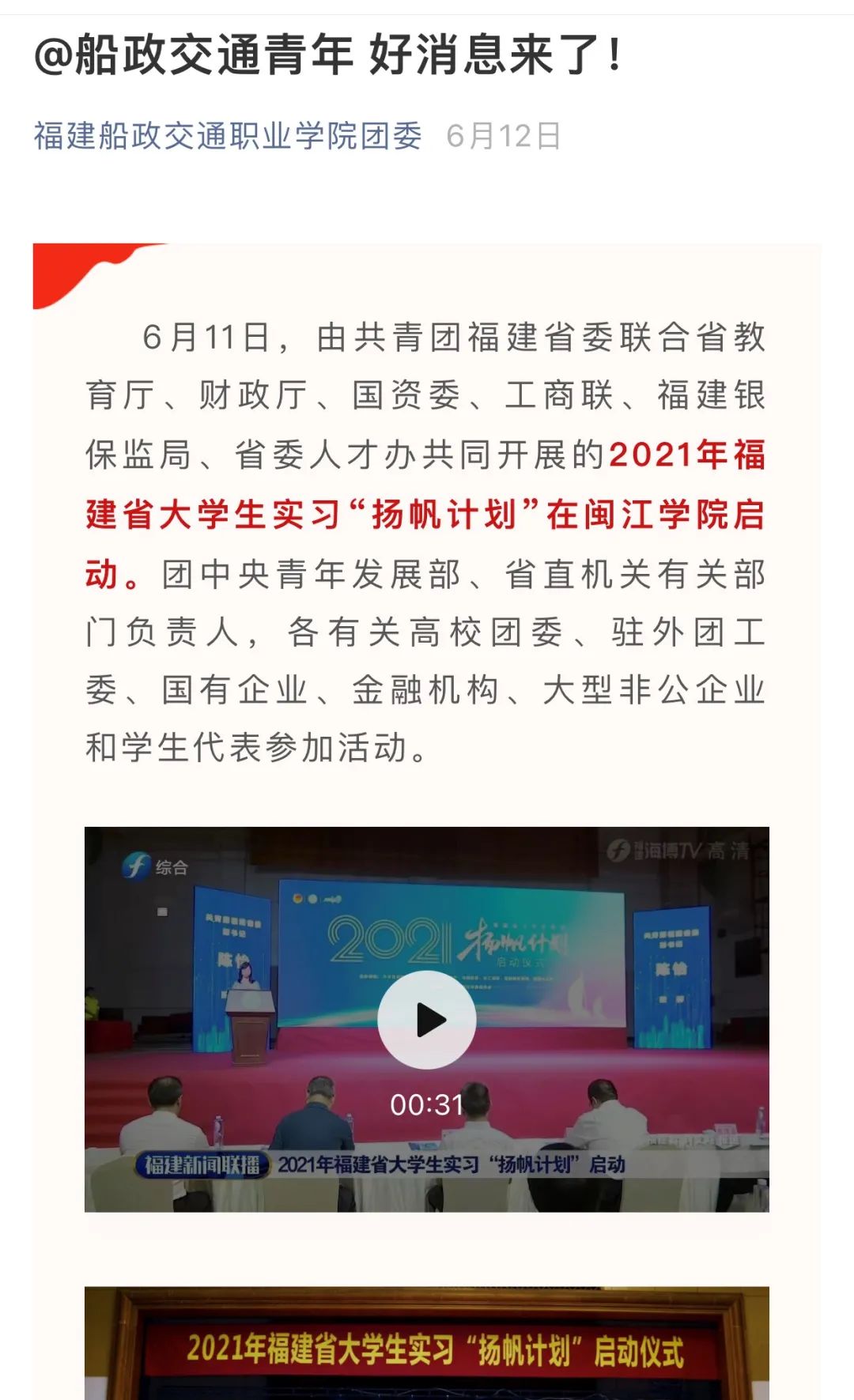 2021年福建省大學(xué)生實(shí)習(xí)“揚(yáng)帆計劃”已正式啟動,首批7257個實(shí)習(xí)崗位發(fā)布,現(xiàn)已進(jìn)入火熱報名階段,為切實(shí)幫助船政交通學(xué)子認(rèn)識、了解、參與“揚(yáng)帆計劃”,準(zhǔn)確定位自己喜歡的實(shí)習(xí)崗位,在社會實(shí)踐中開拓視野,提升自我,校學(xué)生會及時推送和轉(zhuǎn)發(fā)大學(xué)生實(shí)習(xí)“揚(yáng)帆計劃”相關(guān)報道,傳遞最新最快崗位信息。