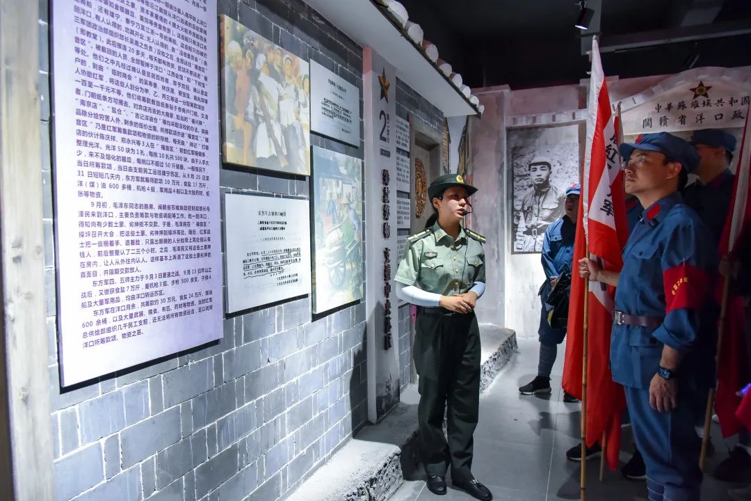 舊址左側(cè)為彭德懷工作及休息室、警衛(wèi)室、會議室等;右側(cè)墻上有彭德懷和滕代遠的簡介和東方軍在洋口擴紅、籌款、建立紅色政權的詳細記載。全體教師團干培訓班成員在彭德懷辦公舊址,留下了一張紅色記憶。