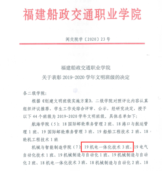 2020、2021連續(xù)兩年被共青團(tuán)福建船政交通職業(yè)學(xué)院委員會(huì)及共青團(tuán)福建船政交通職業(yè)學(xué)院機(jī)械工程系總支委員會(huì)評(píng)為五四紅旗團(tuán)支部;2020年12月被福建船政交通職業(yè)學(xué)院評(píng)為文明班級(jí);2021年5月被共青團(tuán)福建船政交通職業(yè)學(xué)院機(jī)械與智能制造學(xué)院委員會(huì)評(píng)為優(yōu)秀志愿班集體。