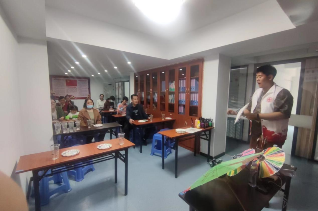 在萬里社區(qū),非遺宣講員詳細(xì)地講解了油紙傘的發(fā)展歷史以及油紙傘的制作工藝,讓在場的每一個人都對油紙傘都有了更深入的了解。講解結(jié)束后,社團(tuán)成員們給萬里社區(qū)的居民們分發(fā)油紙傘,讓他們在油紙傘上繪制圖案,體驗非遺油紙傘的制作樂趣。居民們在一把把油紙傘上親手繪制的不僅是對油紙傘的熱愛,更是對傳統(tǒng)文化的認(rèn)同和傳承。