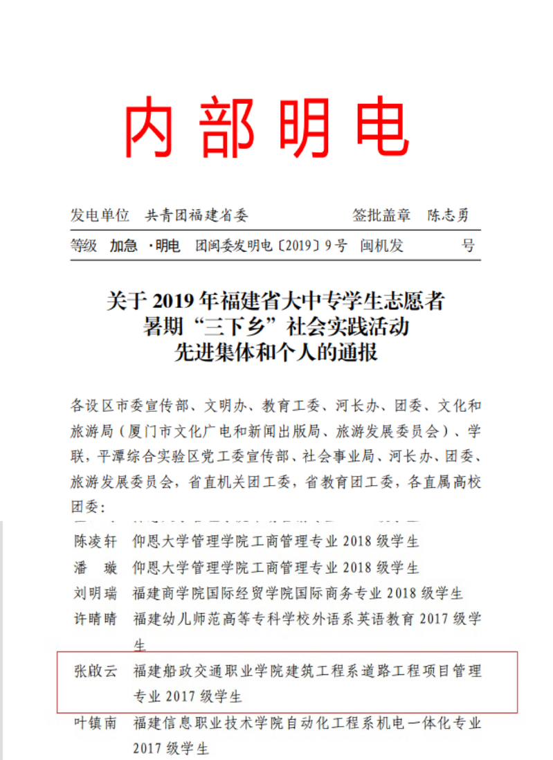 2019年福建省大中專學生志愿者暑期“三下鄉(xiāng)”社會實踐活動先進個人
