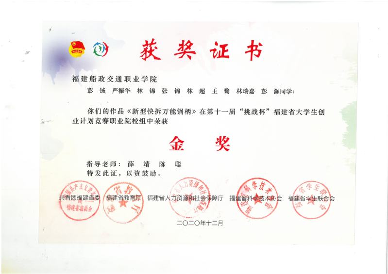 新型快拆萬能鍋柄在第十一屆“挑戰(zhàn)杯”福建省大學生創(chuàng)業(yè)計劃競賽(職業(yè)院校組)獲金獎
