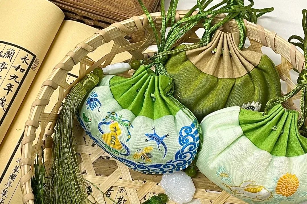端午節(jié)香包又叫香袋、香囊、荷包等,有用五色絲線纏成的,內(nèi)裝用中草藥以及香料,是端午節(jié)特有的民間藝品。