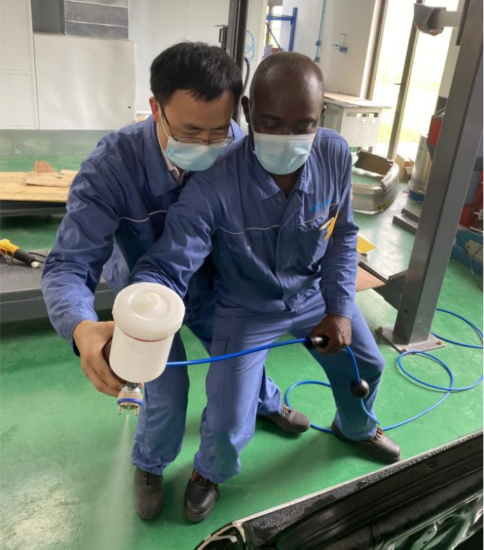 圖2 加蓬團隊手把手教非洲學(xué)員練習(xí)噴漆