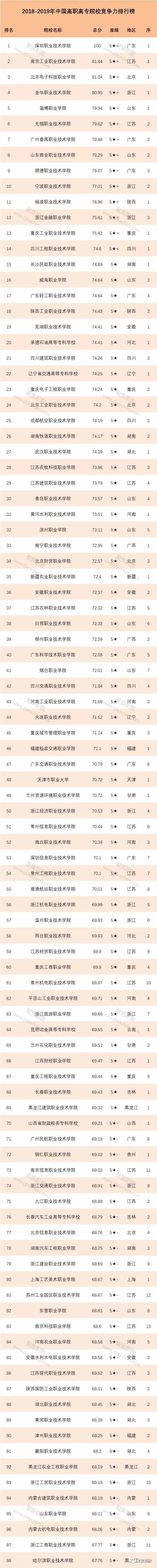中國高職高專院校競爭力排行榜由杭州電子科技大學(xué)中國科教評價研究院(CASEE)、武漢大學(xué)中國科學(xué)評價研究中心(RCCSE)、中國教育質(zhì)量評價中心和《中國科教評價網(wǎng)》聯(lián)合研發(fā)的《中國大學(xué)及學(xué)科專業(yè)評價報告(2018)》正式發(fā)布。該《評價報告》全面、系統(tǒng)、客觀地評價了中國大陸2621所大學(xué)(其中高職高專1386所)的實力和水平,共評定出16類共計673個排行榜。