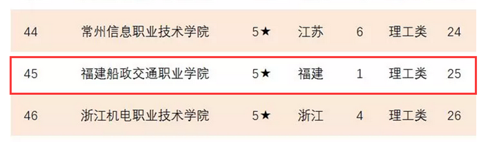 2019年3月28日,第二屆全國(guó)高職高專院?!皟?yōu)質(zhì)校”建設(shè)與評(píng)價(jià)論壇正式發(fā)布了2019年中國(guó)高職高專院校競(jìng)爭(zhēng)力排行榜,福建船政交通職業(yè)學(xué)院獲得5星評(píng)價(jià),全國(guó)排名第45位,福建省第1。