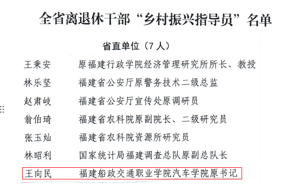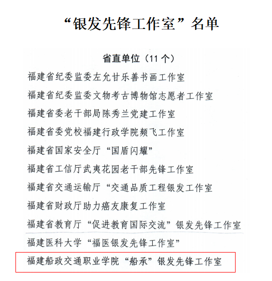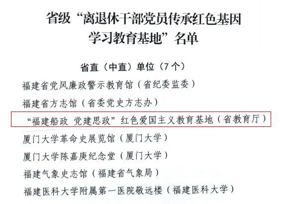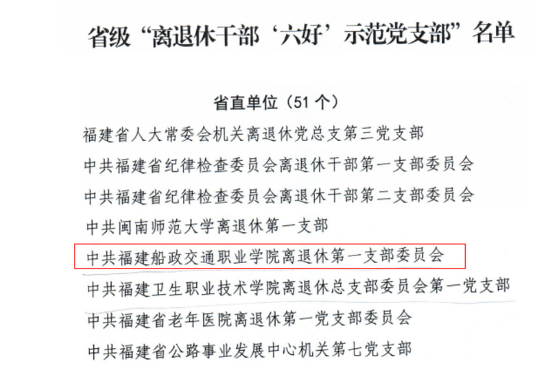 近日,中共福建省委老干部局中共福建省委離退休干部工作委員會(huì)印發(fā)《關(guān)于確定省級“離退休干部‘六好’示范黨支部”等“五個(gè)一百”名單的通知》,學(xué)院“福建船政 黨建思政”紅色愛國主義教育基地獲批省級“離退休黨員傳承紅色基因?qū)W習(xí)教育基地”,中共福建船政交通職業(yè)學(xué)院離退休第一支部委員會(huì)榮獲“省級離退休干部‘六好’示范黨支部”榮譽(yù)稱號,學(xué)院“船承”銀發(fā)先鋒工作室被確定為“銀發(fā)先鋒工作室”,王向民同志被評為全省離退休干部“鄉(xiāng)村振興指導(dǎo)員”。