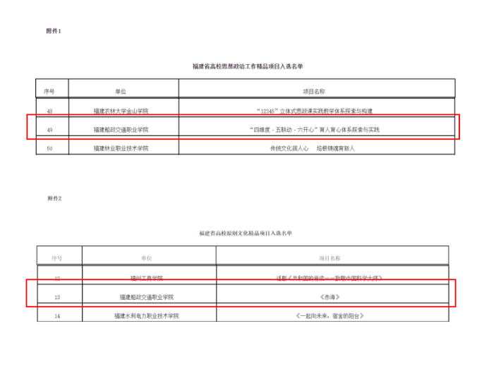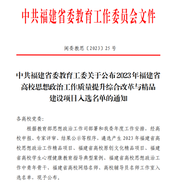 近日,中共福建省委教育工委公布了2023年福建省高校思想政治工作質(zhì)量提升綜合改革與精品建設(shè)項(xiàng)目入選名單,我院“‘四維度·五聯(lián)動(dòng)·六開心’育人育心體系探索與實(shí)踐”、原創(chuàng)話劇《赤海》2個(gè)項(xiàng)目名列其中。