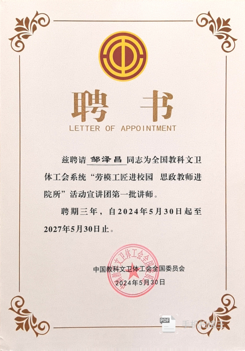 近日,中國教科文衛(wèi)體工會全國委員會印發(fā)《關(guān)于聘請張茂林等163名同志為全國教科文衛(wèi)體工會系統(tǒng)“勞模工匠進(jìn)校園思政教師進(jìn)院所”活動(dòng)宣講團(tuán)第一批講師的決定》,我院鄒澤昌老師被聘為全國教科文衛(wèi)體工會系統(tǒng)“勞模工匠進(jìn)校園思政教師進(jìn)院所”活動(dòng)宣講團(tuán)第一批講師。