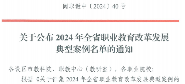 我院堅持以國家“雙高”建設為引領,持續(xù)深化職教改革,在院校治理、人才培養(yǎng)模式改革、教師隊伍、專業(yè)建設、產(chǎn)教融合、對外交流、技術技能創(chuàng)新服務平臺等方面形成了一批可復制、可推廣的典型經(jīng)驗。2022年以來,共10個案例入選全省職業(yè)教育改革發(fā)展典型案例,充分展示我院不斷深化職教改革所取得的新成效。我院將充分發(fā)揮典型案例的示范作用,繼續(xù)深化落實職業(yè)教育改革,探索新時代高職創(chuàng)新發(fā)展的新模式、新路徑,推動職業(yè)教育高質(zhì)量發(fā)展。