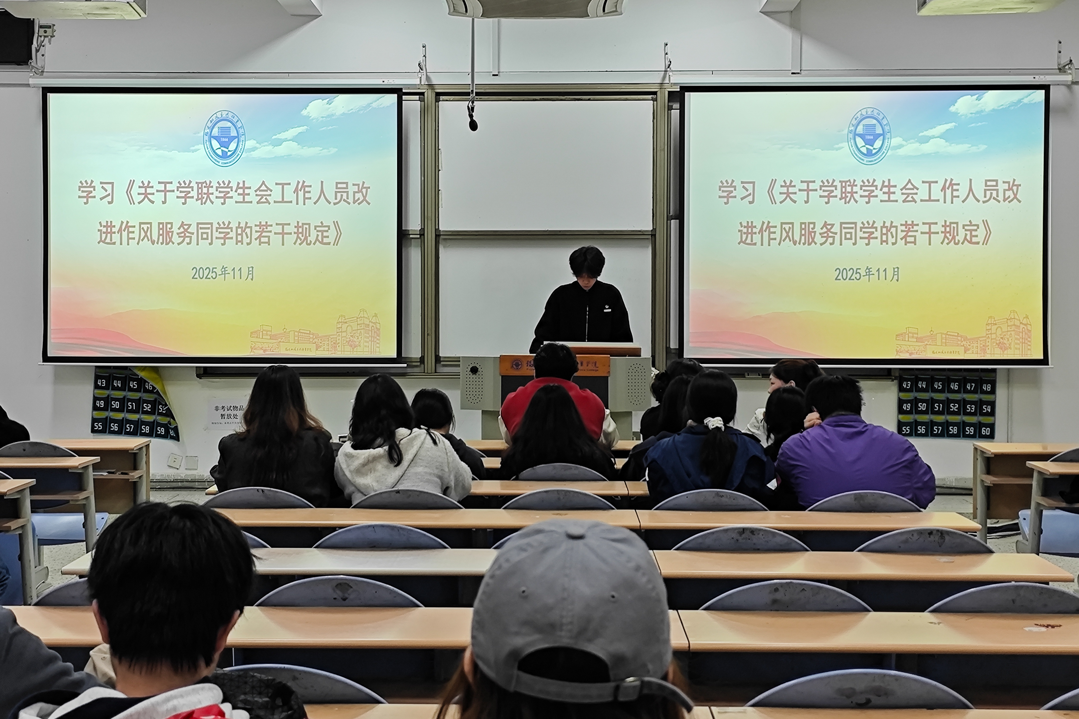 2025年11月12日,安全與環(huán)境學(xué)院于創(chuàng)新樓201教室舉辦2025年秋季學(xué)生骨干培訓(xùn)班。本次培訓(xùn)由校第九期“青馬學(xué)員”、院學(xué)生會(huì)主席黃訓(xùn)臻主持,學(xué)院全體學(xué)生干部參加。