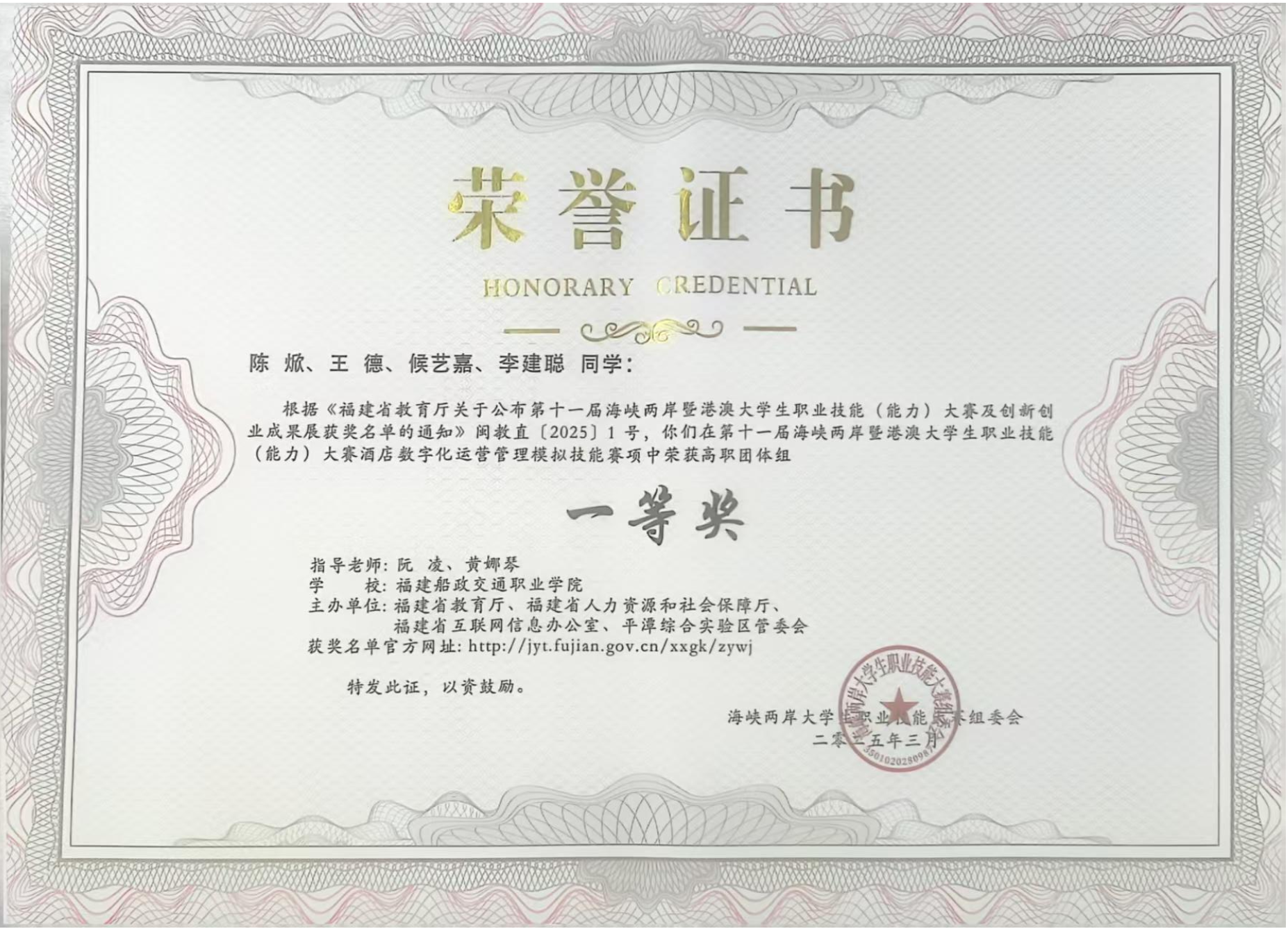 第十一屆海峽兩岸暨港澳大學(xué)生技能大賽中,榮獲酒店數(shù)字化運營管理模擬賽項一等獎,展現(xiàn)了卓越的數(shù)字化管理能力;