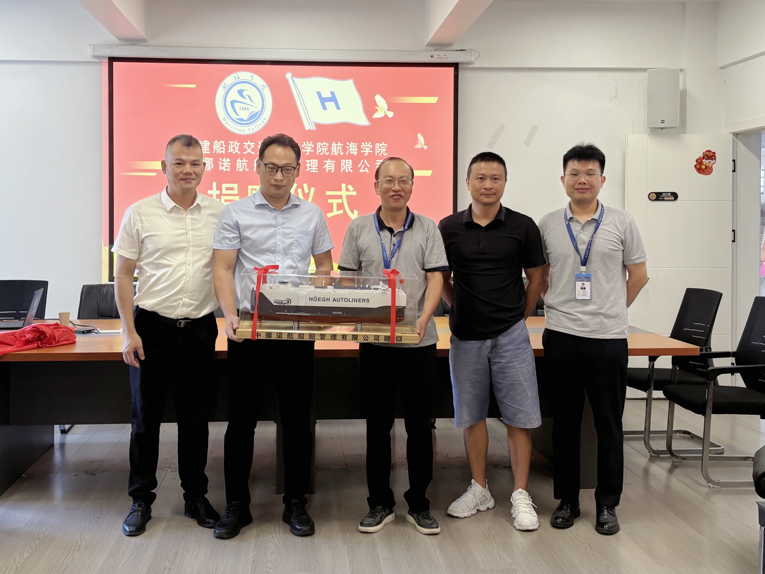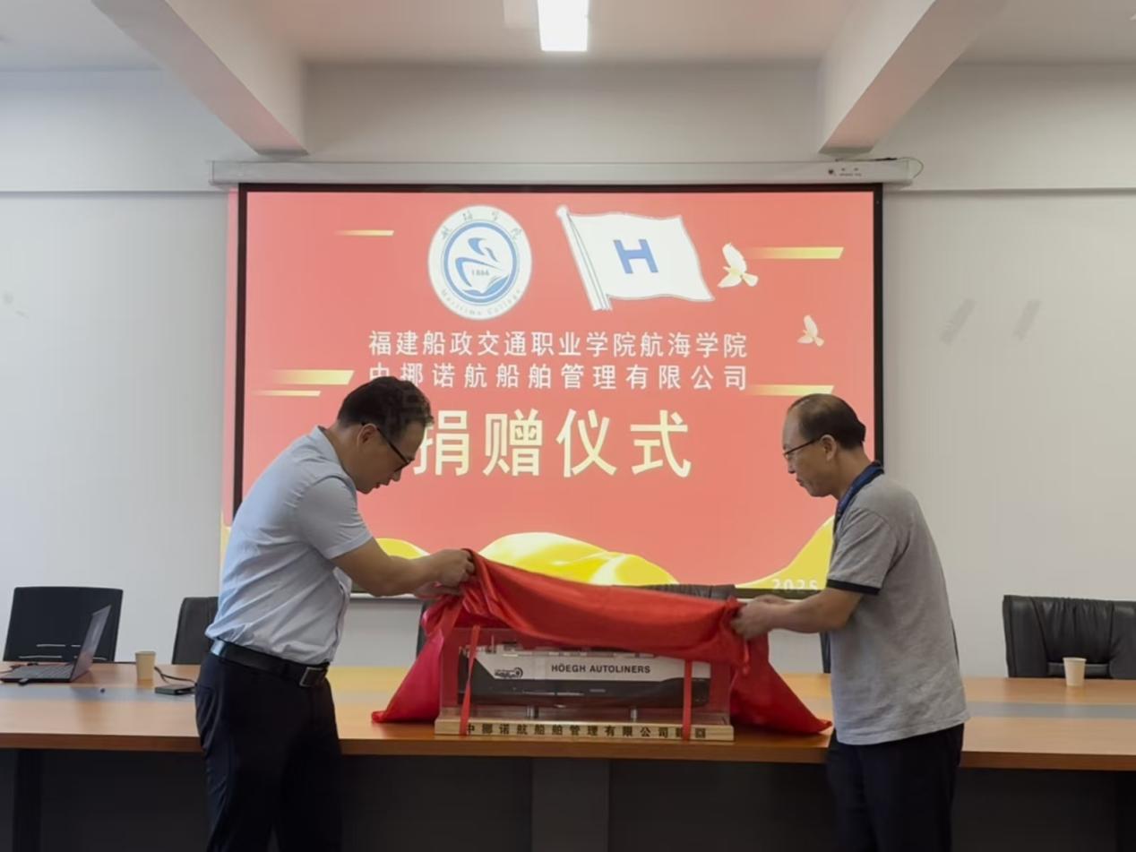 2025年9月11日,福建船政交通職業(yè)學(xué)院迎來了一份意義非凡的禮物——中挪諾航船舶管理有限公司專程向我院捐贈(zèng)了一艘精美的中型滾裝船模型。捐贈(zèng)儀式在校友之家307教室舉行,學(xué)院黨總支書記江文、企業(yè)代表與航海學(xué)院師生代表共同見證了這一重要時(shí)刻。