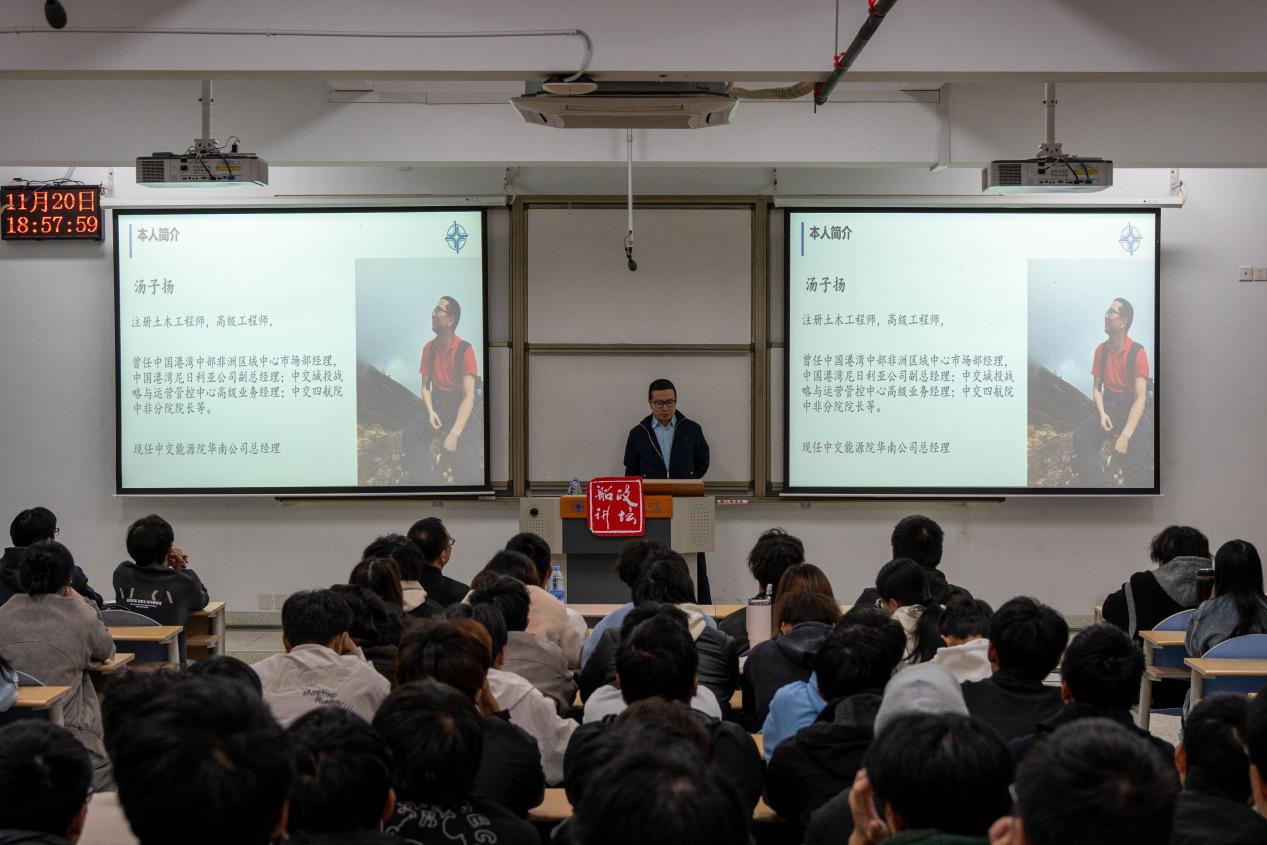 在經(jīng)濟全球化深入推進、中國企業(yè)“走出去”步伐加快的背景下,為幫助同學們了解國際市場的規(guī)則、文化與競爭環(huán)境,最終實現(xiàn)可持續(xù)的跨國發(fā)展。2025年11月20日,土木工程學院在福船園創(chuàng)新樓301開展“踐行企業(yè)責任——中國企業(yè)國際化的機遇與挑戰(zhàn)”主題講座。本次講座特邀中交能源院華南公司總經(jīng)理、注冊土木工程師湯子揚高級工程師主講,近百名學子齊聚現(xiàn)場,共同探尋中國工程企業(yè)“走出去”的奮斗之路與發(fā)展之道。