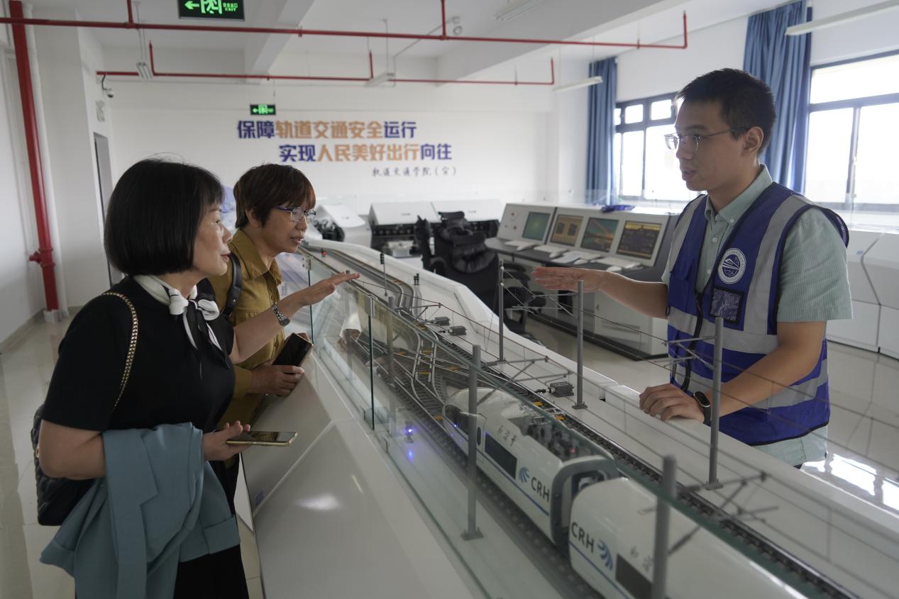 老同志們一踏入軌道交通學院,便感受到了濃厚的學術氛圍和現(xiàn)代氣息。在軌道實訓室,他們被一系列先進的專業(yè)實驗實訓設施深深吸引。這些現(xiàn)代化的教學設備,展現(xiàn)了軌道交通專業(yè)的前沿發(fā)展。