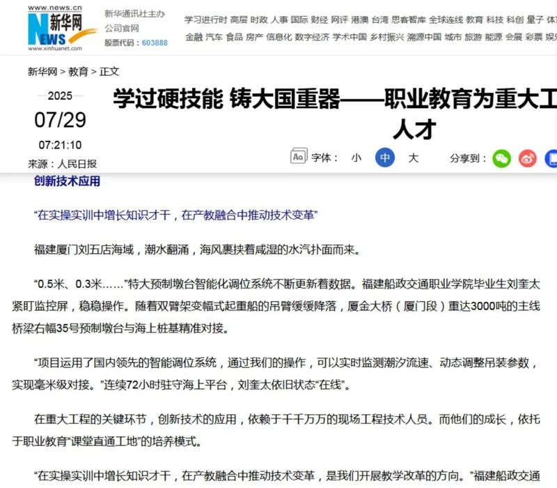7月29日,人民網(wǎng)、新華網(wǎng)、光明網(wǎng)、中國網(wǎng)等中央主流媒體報道我院畢業(yè)生劉奎太參與廈金大橋(廈門段)建設(shè),展現(xiàn)學(xué)院在產(chǎn)教融合育人方面所取得的顯著成效。具體報道情況如下: