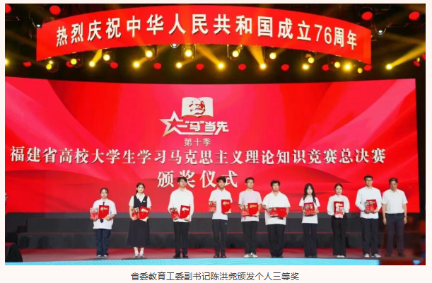 為深入學(xué)習(xí)貫徹習(xí)近平總書記關(guān)于學(xué)校思政課建設(shè)的重要指示精神,貫徹落實(shí)全國、全省教育大會(huì)精神,堅(jiān)持不懈用習(xí)近平新時(shí)代中國特色社會(huì)主義思想鑄魂育人,9月27日,由中共福建省委宣傳部、中共福建省委教育工委主辦,福建省高校思想政治理論課教學(xué)指導(dǎo)委員會(huì)、福建教育電視臺(tái)承辦的第十季福建省高校大學(xué)生學(xué)習(xí)馬克思主義理論“一‘馬’當(dāng)先”知識(shí)競賽總決賽在福建農(nóng)林大學(xué)成功舉辦。我院黨委書記陳宜大攜師生代表參與活動(dòng)。