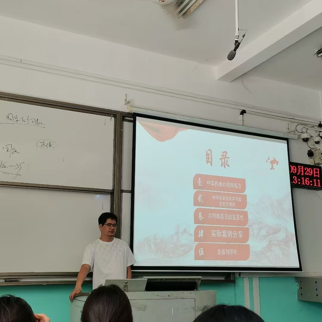 主題班會是本次活動的開篇之作。班會上,由輔導(dǎo)員通過 PPT 展示,向同學(xué)們介紹了我國各民族的分布、人口、語言、風(fēng)俗習(xí)慣等基本情況,讓同學(xué)們對我國的民族大家庭有了更全面的了解。各民族在相互學(xué)習(xí)、交流融合中形成的獨(dú)特風(fēng)貌和共同價值追求。隨后,來自不同民族的同學(xué)紛紛上臺分享自己的民族故事、風(fēng)俗習(xí)慣以及在與其他民族同學(xué)相處中的溫馨故事,現(xiàn)場氣氛溫馨而熱烈。通過本次班會,同學(xué)們不僅增強(qiáng)了民族團(tuán)結(jié)意識,豐富了民族文化知識,還營造了團(tuán)結(jié)和諧的校園氛圍。在今后的工作中,我們將繼續(xù)深入開展民族團(tuán)結(jié)教育活動,不斷創(chuàng)新活動形式,豐富活動內(nèi)容,努力提高民族團(tuán)結(jié)教育的實(shí)效性。同時,我們也將積極引導(dǎo)同學(xué)們將民族團(tuán)結(jié)的精神轉(zhuǎn)化為實(shí)際行動,在學(xué)習(xí)和生活中,關(guān)心關(guān)愛各民族同學(xué),共同為實(shí)現(xiàn)中華民族偉大復(fù)興的中國夢而努力奮斗。