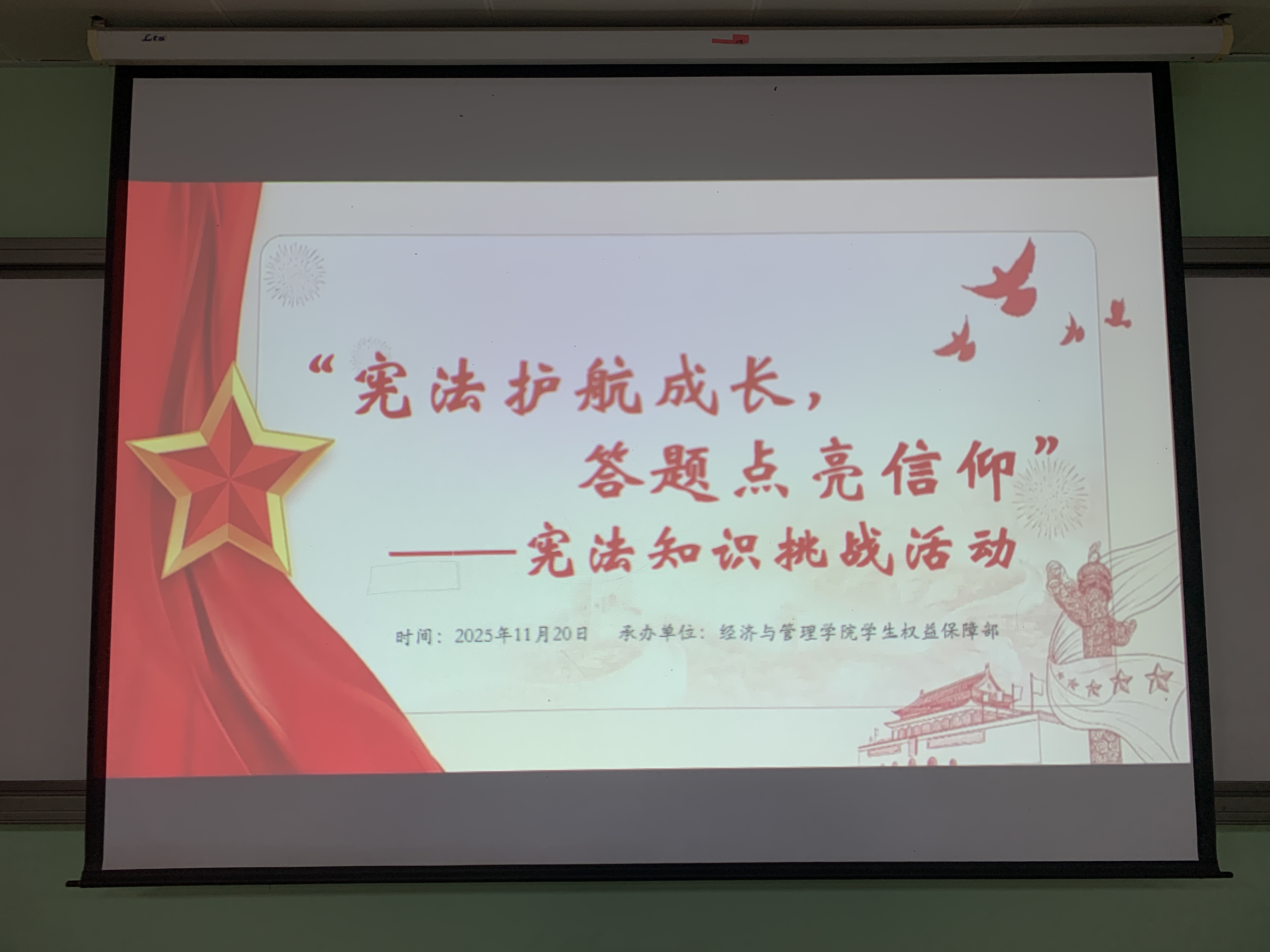 為深入學(xué)習(xí)貫徹習(xí)近平法治思想,弘揚(yáng)憲法精神,增強(qiáng)青年的憲法意識(shí)、法治觀念與素養(yǎng),引導(dǎo)其自覺尊法學(xué)法守法用法,讓法治力量護(hù)航青春成長(zhǎng),我院將于2025年12月4日16:00—17:00,在南區(qū)經(jīng)管樓407舉辦“憲法護(hù)航成長(zhǎng),答題點(diǎn)亮信仰”憲法知識(shí)挑戰(zhàn)活動(dòng)。