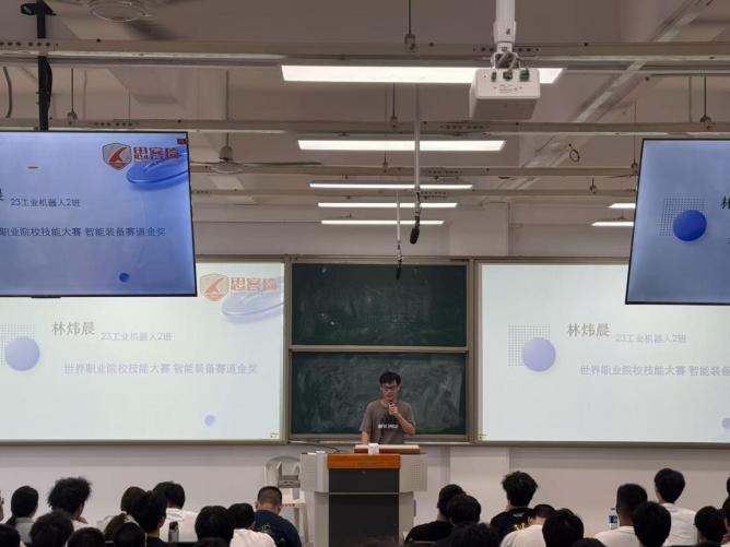 2025年世界技能大賽金獎(jiǎng)獲得者、我院23級(jí)工業(yè)機(jī)器人專業(yè)學(xué)生林煒晨分享了他的備賽歷程與成長體會(huì)。他提到,在機(jī)器人競賽團(tuán)隊(duì)中系統(tǒng)性的訓(xùn)練,包括編程、算法學(xué)習(xí)與機(jī)器人反復(fù)拆裝等實(shí)戰(zhàn)內(nèi)容,不僅極大提升了其專業(yè)技能,更讓他明確了職業(yè)方向。他鼓勵(lì)新生充分了解學(xué)校提供的競賽激勵(lì)政策,積極參與課外興趣小組,全面提升綜合能力。
