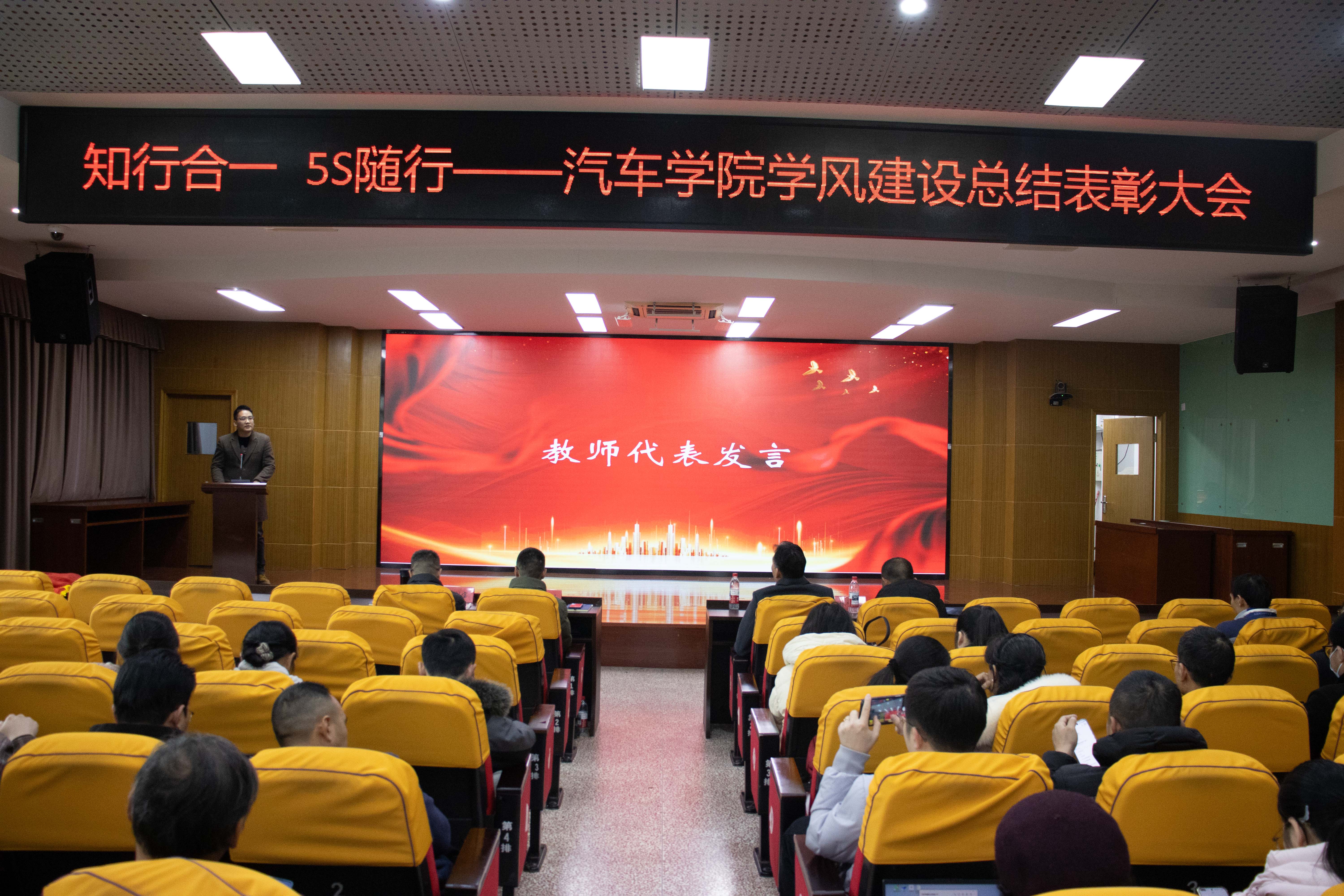 為進一步加強學風建設(shè),表彰先進、樹立典型,汽車學院于1月21日在北區(qū)一號行政樓6樓學術(shù)報告廳開展“知行合一、5S隨行”——汽車學院學風建設(shè)總結(jié)表彰大會。學院領(lǐng)導班子、全體教師、輔導員及各班級學生代表參加此次大會。大會由分團委書記余晨煒主持。