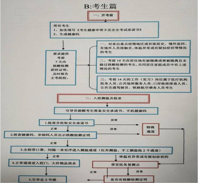 2.來自重點(diǎn)疫情地區(qū)或有旅居史、境外返回、境外人員接觸史、體溫異?;蛴幸伤瓢Y狀等情況,考前14天曾被隔離或曾被隔離未做過核酸檢測(cè)、共同居住家庭成員有上述情況的考生,考前14天的工作(實(shí)習(xí))崗位屬于醫(yī)療機(jī)構(gòu)醫(yī)務(wù)人員、公共場所服務(wù)人員、口岸檢疫排查人員、公共交通駕駛員或鐵路航空乘務(wù)人員的考生,上述考生須提供考前7天內(nèi)核酸檢測(cè)陰性證明后方可進(jìn)入學(xué)校,無提供核酸證明者不得進(jìn)入校園!