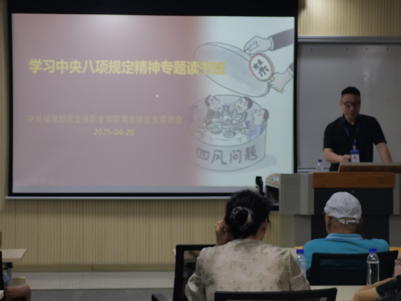 為進一步加強離退休干部黨員的思想政治建設,4月20日,福建船政交通職業(yè)學院離退休黨組織舉辦了專題讀書班,將學習中央八項規(guī)定及其實施細則精神作為重要內(nèi)容,組織廣大離退休干部黨員全面系統(tǒng)學習了習近平總書記關(guān)于加強黨的作風建設的重要論述。