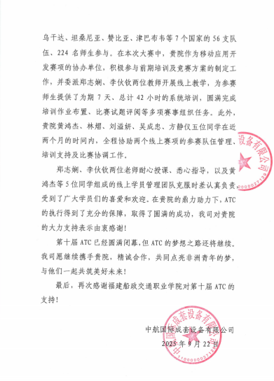 近日,由中航國(guó)際成套設(shè)備有限公司、肯尼亞教育部和中國(guó)教育國(guó)際交流協(xié)會(huì)聯(lián)合主辦的第十屆非洲職業(yè)技能挑戰(zhàn)賽(Africa Tech Challenge,簡(jiǎn)稱(chēng)“ATC”)圓滿(mǎn)落幕。我院信息與智慧交通學(xué)院師生團(tuán)隊(duì)全程護(hù)航移動(dòng)應(yīng)用開(kāi)發(fā)賽項(xiàng),以專(zhuān)業(yè)師資精準(zhǔn)授課、青年志愿暖心服務(wù),圓滿(mǎn)完成了線上培訓(xùn)與技術(shù)保障任務(wù),并獲主辦單位中航國(guó)際成套設(shè)備有限公司專(zhuān)函致謝。